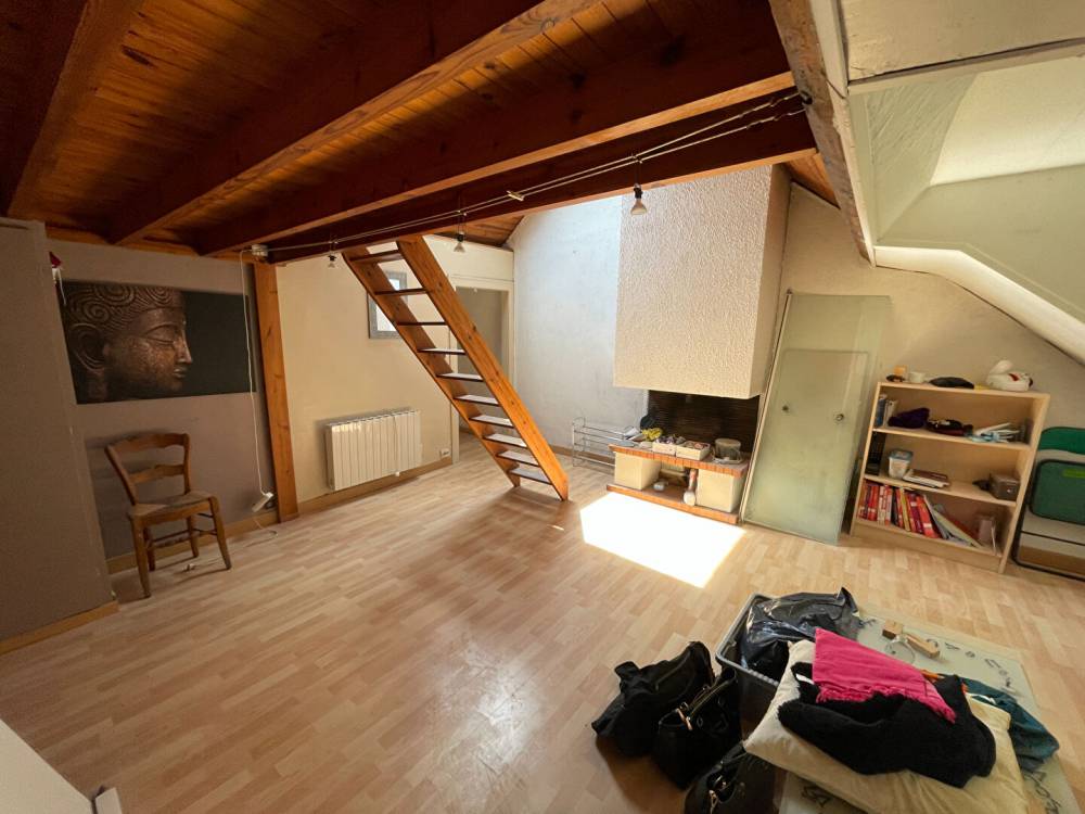 Un sas d'entrée distribuant les différentes pièces, un séjour lumineux côté rue avec mezzanine, une cuisine indépendante, une salle de bain avec WC côté cour.